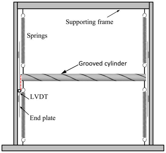Measurements of the cross-flow vibration of both the bare and the grooved cylinders were conducted over a range of Reynolds numbers 1 × 104 < Re < 4 × 104 in the closed-circuit wind tunnel with a test section of 1300 mm (width) × 1800 mm (height) to quantify the effectiveness of helical grooves on the suppression of VIV. The cylinders have an external diameter d of 60 mm and a length of 1290 mm. The aspect ratio L/d for both cylinders is 20. The grooved cylinder was fabricated by adhering lengths of EPDM (Ethylene Propylene Diene Monomer) rubber tape around a bare cylinder, resulting in a diameter d of 80 mm. The grooves had a pith length of 7.5d, a width of 0.19d, and a depth of 0.12d. The mass of the bare cylinder was 1.84 kg and the mass of the cylinder with grooves was 1.96 kg. The test cylinders were flexibly mounted to a steel frame by four identical steel springs to suspend the cylinder approximately 900 mm off the wind tunnel floor. The springs were selected based on their stiffness and length. They must be stiff enough and long enough to remain in tension when measuring the amplitude of vibrations. The four springs were made of steel and had a stiffness of 1680 N/m with an original length of 260 mm. The stiffness was measured by applying a known load to the springs and measuring the subsequent deflection. Once the springs were attached to the cylinder, the top and bottom springs were extended to a length of approximately 325 mm to ensure the system was in tension throughout testing. The experimental setup for cylinder VIV is illustrated in Figure 1.
