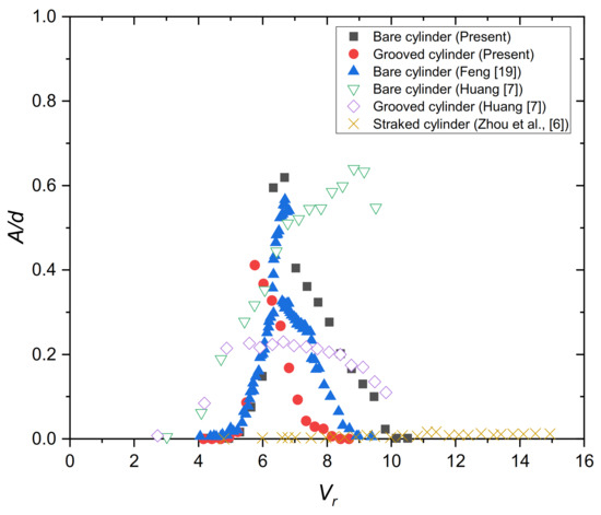 4.1. Vortex-Induced Vibration for the Bare and Grooved Cylinders