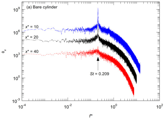 Spectral analysis is conducted to determine the vortex shedding frequency based on the transverse velocity components measured by an X-type hot-wire probe using Fast Fourier Transforms (FFT). Figure 4 shows the spectra for both bare cylinder and grooved cylinder wakes measured at y* = 1 for different streamwise locations, where the frequency is normalized as f* = fD/U∞, and the peak frequency corresponds to the Strouhal number. For the convenience of comparing the results, the spectra have been shifted down by a factor of 10 compared with the last location. It can be seen that vortex shedding at each downstream location is apparent at a singular frequency indicated by a sharp peak. This peak frequency corresponds to f* = 0.21 for the bare cylinder and 0.20 for the grooved cylinder. Both values agree well with the consensus results reported in the literature, indicating that vortex shedding still exists in the wake of the helically grooved cylinder. This result is apparently different from that for the straked cylinder wakes [6], where it was shown that vortex shedding had been suppressed successfully by the helical strakes, as shown in Figure 4. The peak heights decrease quickly as evolving downstream, indicating the decay of the vortices. At the downstream location of x* = 40 the peak height, relative to its plateau, is far less noticeable, indicating that at this location, the vortices have nearly decayed completely. When comparing the peak energy of the cylinders at the downstream location of x* = 10, the bare cylinder displays a 5% higher peak energy response than that of the grooved one, indicating that the grooves may disrupt the intensity of vortices.