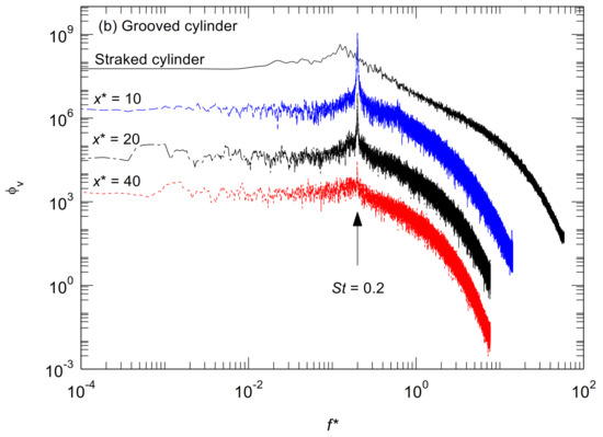 Energy spectra Φ in the wake at y* = 1 for different streamwise locations. (a) bare cylinder; (b) grooved cylinder. The spectrum for the straked cylinder is from [6] measured at x* = 5 for Re = 20,430.