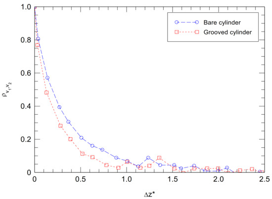 The cross-correlation coefficients between and measured at x* = 10 and Re = 19,000 are shown in Figure 5. It can be seen that all the cross-correlation coefficients decrease with the increase of probe separation, especially at small separations. The magnitude of in the bare cylinder wake is much larger than that in the grooved cylinder wake, indicating larger vortical structures for the former than the latter at this downstream location. The correlation length evaluated using Equation (10) of the bare cylinder wake is 0.35d, which is about 30% higher than that of the grooved cylinder wake ( = 0.27d). This result suggests that the helical grooves have successfully disrupted the vortical structures in the spanwise direction and thus enhancing the three-dimensionality of the flow. It is in agreement with that proposed by Bearman and Branković [22], who suggested that the strakes do not necessarily suppress vortex shedding, but they prevent the shedding from becoming correlated along the span. The above values of the correlation length of the two wakes are much smaller than those obtained at x* = 5 for bare and the straked cylinders [6], indicating the quick decay of the vortical structures.