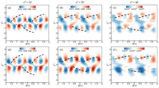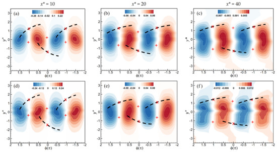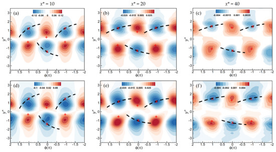 Phase-averaged velocity, , for the bare cylinder wake (a) at x* = 10, contour interval = 0.02; (b) at x* = 20, 0.005; and (c) at x* = 40, 0.0005; and the grooved cylinder wake (d) at x* = 10, 0.02; (e) at x* = 20, 0.005; and (f) at x* = 40, 0.001. The plus and the cross represent the foci and the saddle points, respectively. The thick dashed lines indicate the diverging separatrices that pass through the saddles. The flow direction is from left to right.