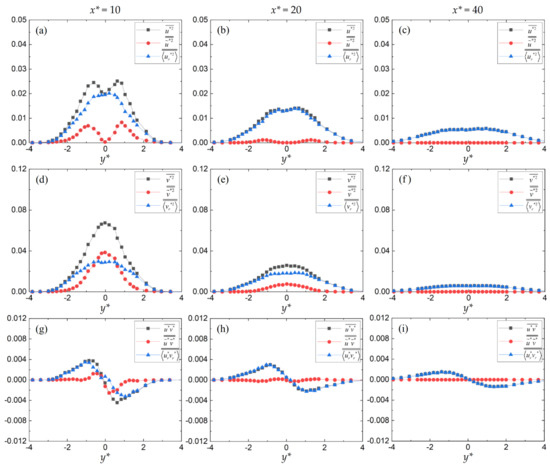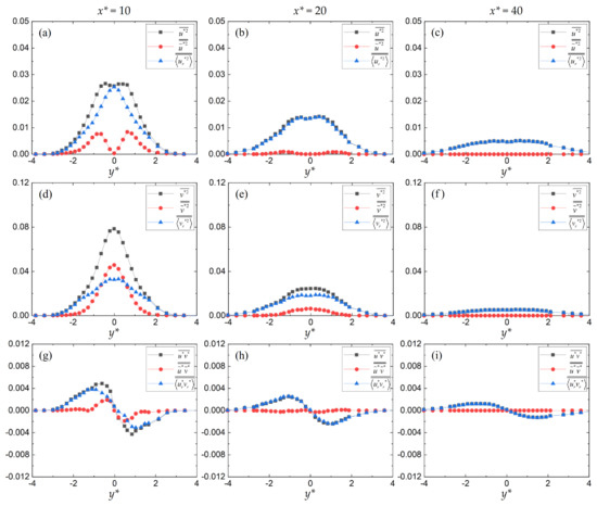 Coherent (○) and incoherent (Δ) contributions to the time-averaged (●) Reynold stresses for the grooved cylinder wake. (a–c) Reynolds normal stress uu; (d–f) Reynolds normal stress vv; and (g–i) Reynolds shear stress uv.