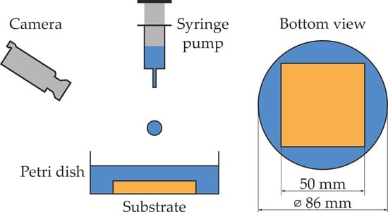 The droplet velocity is varied by changing the distance between the needle tip and the Petri dish. The velocity of a falling droplet and its diameter were determined from side view images captured by the high-speed camera. The details of the image processing can be found in [17,19]. The ranges of considered experimental conditions are presented in Table 2.