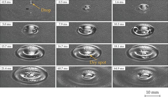 - Josserand, C.; Ray, P.; Zaleski, S. Droplet Impact on a Thin Liquid Film: Anatomy of the Splash. J. Fluid Mech. 2016, 802, 775–805. [Google Scholar] [CrossRef] [Green Version]
