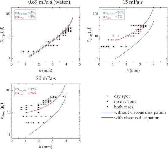 where is the number of experimental points for which dry spot was observed, but droplet energy was lower than the value of Equation (9), is the number of experimental points for which dry spot was not observed, but droplet energy was higher than the value of Equation (9); and are total number of experimental points with and without dry spot, respectively. The separation errors were averaged for all considered viscosities: