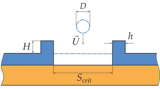 To describe the observed phenomena, as a first step, we used the approach proposed in [17] for the inviscid case. The approach in [17] assumes that a stable dry spot appears in a liquid film, if the droplet energy is sufficient to form a cylindrical crater with a critical size of a dry base (Figure 4). The critical area of the dry base, , was determined by calculation of the difference of free energies of the state of the film with and without the dry spot. The curve of the free energy difference versus the area of dry spot showed an energy barrier. If the film overcomes this barrier, then a state with a dry spot becomes favorable.