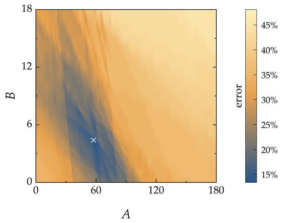 Distribution of the average separation error of the crater model with viscous dissipation of energy (Equation (9)) at different constants and . The white cross shows the constants (57.5; 4.4) at which the error has minimum value.