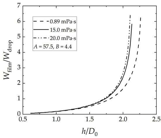 The fitting of the developed model to experimental data allows us to evaluate the contribution of the viscous dissipation in a drop and a film (Figure 6). As the critical area of the crater bottom, , depends on the film thickness, the viscous dissipation in a film increased with increasing of the film thickness. The ratio of film to drop dissipation are not the same for the different viscosities, because of the difference in other fluid properties that influence the critical area. Nevertheless, the results in Figure 6 show that the contribution of viscous dissipation of energy in the film dominates for cases where film thicknesses to droplet diameter ratio are larger than 7/4.