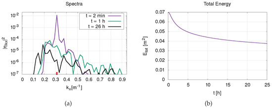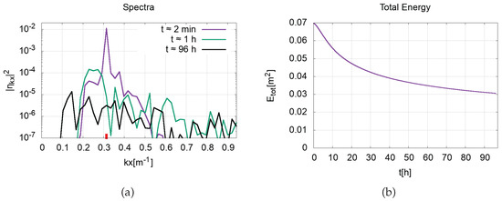 (panel a) and the dependence of total energy on time (panel b). It can be seen that the spectrum shifts to the region of long-wave harmonics with time; that is, the waves in the channel become longer along the x axis. Taken together with the two-dimensional spectrum, one can conclude that the waves become slightly longer in the x axis direction and significantly longer in the y axis direction. The total energy of the system gradually decreases due to the damping concentrated in the region of short-wave harmonics. It can be seen that the energy was almost halved in 96 h.