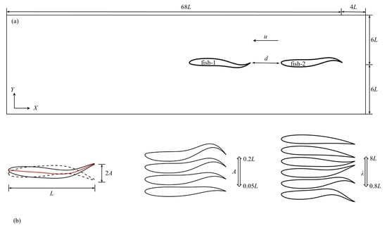 In this study, two identical fish-like NACA0012 foils self-propel from the right to left side of computational domain, and the fish are allowed to move in a horizontal (x) direction. Figure 1 presents a sketch of computational domain with two fish in tandem arrangement, and the fish parameters are also involved. As shown in Figure 1a, two fish swim along the x-direction by creating undulatory motion in the y-direction. As presented in Figure 1b, the fish length is L, and the tail beat amplitude of the fish is A. The kinematics for carangiform swimmers is usually in the form of a backward traveling wave with the largest wave amplitude at the fish tail. To account for the traveling wave, the displacement of the midline of fish from the x-axis is given by