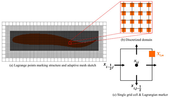 In this work, the IB method together with adaptive mesh refinement (IBAMR) [21,33] is employed to deal with the fish motion. The hydrodynamic approach version of IB method has been used. This IB method is suitable for problems in which the aim is to determine swimming velocities or forces generated during swimming. The deformational kinematics data required by the hydrodynamic approach to simulating aquatic locomotion can be obtained from experiments [28,34,35,36,37,38,39]. The IB formulation uses an Eulerian description for the momentum equation and divergence-free condition for both the fluid and the structure. A Lagrangian description is employed for the structural position and forces, more details refer to [40]. IBAMR relies on SAMRAI [41,42,43] for Cartesian grid management and the adaptive mesh refinement [44,45,46] framework. Solver support in IBAMR is provided by PETSc library [47]. Adopting IB method permits us to avoid body conforming mesh discretization and to use fast Cartesian grid solvers. The effect of the fish body on the fluid is implemented via an additional body force that is added to the (fluid) momentum equation. The Cartesian grid adaptive mesh refinement is applied for the fish motion, and thereby the thin boundary layers at fluid-solid interfaces as well as flow structures shed from such interfaces can be captured efficiently. The numerical method adopted has been applied successfully to simulate fish-like swimming problems [25,48,49,50,51,52,53,54]. In this study, the fish body structure is marked by Lagrangian points and then Lagrangian discretization. Quantities attached to the structure are described in a Lagrangian frame on immersed markers that are free to arbitrarily cut through the background Cartesian mesh. These nodes are indexed by (l, m) with curvilinear mesh spacing (, ), each cell center of the grid has position = ((), ()) for i = 0,…, 1, j = 0,…, 1. For a given cell (i, j), = (, ()) is the physical location of the cell face that is half a grid space away from in the x-direction, = ((), ) is the physical location of the cell face that is half a grid cell away from in the y-direction, and the position of a marker point is denoted as . A staggered grid discretization for quantities described in the Eulerian frame was adopted, and refer readers to [55] for more details. Figure 2 gives a sketch of the spatial discretization. The computational domain is discretized using an adaptively refined grid for which the finest grid resolution is = = 0.0026L. The time step size is taken to be = 0.0005T. More information on the grid and time-step independence tests can be found in the Supplementary Material S1, and further convergence studies of IB method have been published in previous work [21,52,55].