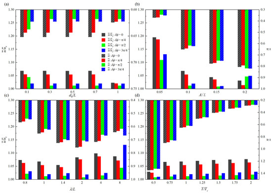 As shown in Figure 3c, the variation of / with respect to is complex. For the cases of = 0 and /4, the extreme values of / occur at the same wavelength, i.e., the maximum and minimum / appear at = 4L and = 1.4L, respectively. The corresponding speed gains are 9.9% and 5.4% when = 0, and 8.7% and 4.7% when = /4. Similarly, for the cases of = /2 and = 3/4, the maximum and minimum / appear at = 8L and = 2L, respectively. The corresponding speed gains are 13.1% and 1.9% when = 3/4, and 4.4% and 0.8% when = /2. However, different phase differences can generate the extreme values of at the same wavelength, and the maximum and minimum appear at = 2L and = 0.8L, respectively.