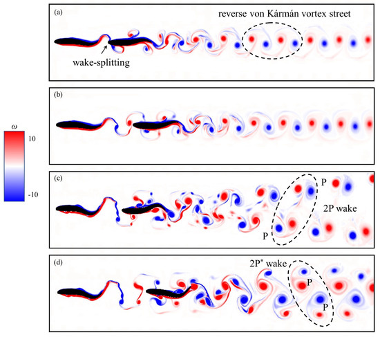 Figure 4a,b also present the phenomenon of wake transformation from the von Kármán vortex street into the reverse von Kármán vortex street. It produces a momentum surfeit region in the near wake region of the body, and causes a negative drag, which is also termed as thrust force [57]. This is also a reason for the speed gain of tandem arrangement swimming. In Figure 4c,d, the vortex patterns of 2P and 2P [58,59] are formed, respectively. The 2P wake structure is believed to be responsible for the performance enhancement, and the propulsion mechanisms have been explained in previous work [60]. For the four cases in Figure 4, in order to observe the evolution of vortex in the process of motion more intuitively, the dynamic view of two fish swimming is presented in the Supplementary S2. Whether the form of vortex evolution is regularly correlated with swimming parameters, which needs to be further studied in the future.