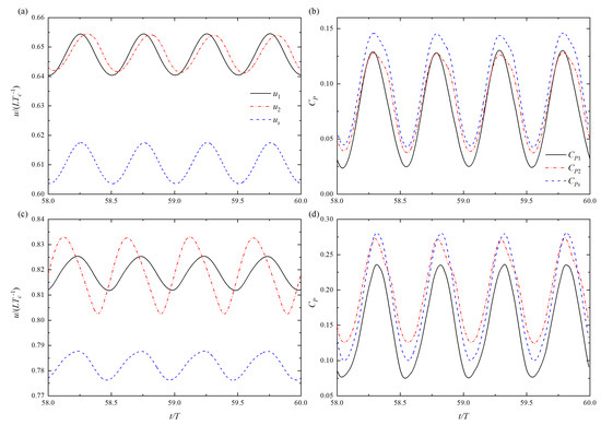 For the case of = 0.5L and A = 0.2L, there is also a phase shift of u curve between the upstream fish and the rear fish, as shown in Figure 5c. The speed amplitude of the rear fish is larger than that of the upstream fish. Similarly, u curve of upstream fish is hardly affected, as compared with the isolated fish. As can be observed from Figure 5d, the power coefficient still changes periodically. However, the power coefficient of the isolated fish is no longer greater than that of the rear fish in the tandem arrangement. The relationship of the power coefficient is as follows: > > . It is known that for the tandem arrangement, the speed waveform of the upstream fish is not affected basically.
