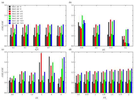 Ratios of cost of transport with different (a) initial separation distance , (b) tail beat amplitude A, (c) wave length , and (d) period of oscillation T. in the denominator represents either of the upstream fish or of the rear fish.