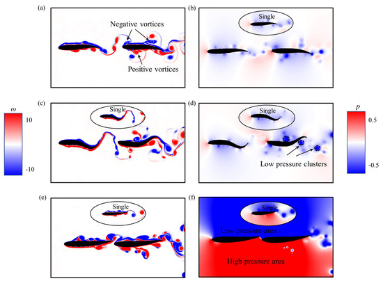 Based on the results in Figure 6, it is indicated that the variation of energy-saving efficiency is not exactly the same as the speed gain variation presented in Figure 3, which confirms the conclusion that high propulsive efficiency does not necessarily mean energy-saving [31]. To further explore the impact of swimming parameters on the energy-saving efficiency, the vortex interaction in different states, the changes of instantaneous pressure near the fish body and the changes of mean work done by fish during swimming are analyzed. Some typical instantaneous vorticity and pressure contours are presented in Figure 7. Meanwhile, the ratios of mean work done by the upstream fish to the rear fish and the isolated fish to two tandem fish at different swimming parameters are illustrated in Figure 8.