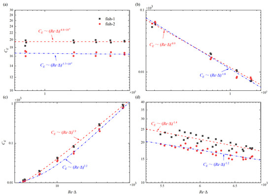 Despite the vast phylogenetic spread of inertial swimmers [64], it is found that their locomotory dynamics can be governed by the power law of ∼. Figure 10 shows different scaling laws between the upstream fish and the rear fish in a tandem arrangement. As shown in Figure 10a, when only changes, the scaling laws are