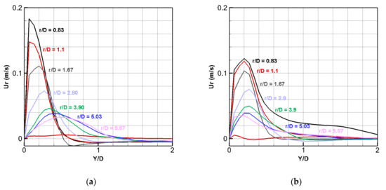 Mean radial velocity profiles for the impinging jet onto (a) stationary and (b) rotational disk (200 RPM).