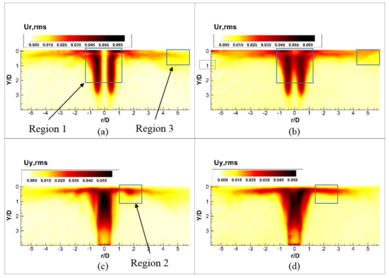 Radial and longitudinal turbulence intensity distributions are plotted in Figure 3 for the stationary and the rotating cases. For the rotational case, the radial turbulence intensity (Ur,rms) presents higher values upstream from the impinging plate and in the outer near-wall region of the plate—Regions 1 and 3 in Figure 3a,b. The vertical turbulence intensity (Uy,rms) shows higher amplitude in the impinging region—Region 2 in Figure 3c,d, with the stationary disk as compared to the rotational case. This suggests that the centrifugal force of the rotational disk results in inducing swirl into the free jet just upstream from its impingement on the rotating wall. Such jet swirl results in a modified vortical structures and enhanced mixing which would be responsible for the distribution of the radial RMS observed in Region 1. The centrifugal force also results in an advection of the large vortical structures closer to the impinging wall when traveling from the jet center outward in the radial direction. For the stationary case, the large vortical structures separate from the wall in Region 2. This results in a lower vertical turbulence intensity observed in Region 2 for the rotational case and the higher radial turbulence intensity close to the wall in the outer region—Region 3 in Figure 3a,b.