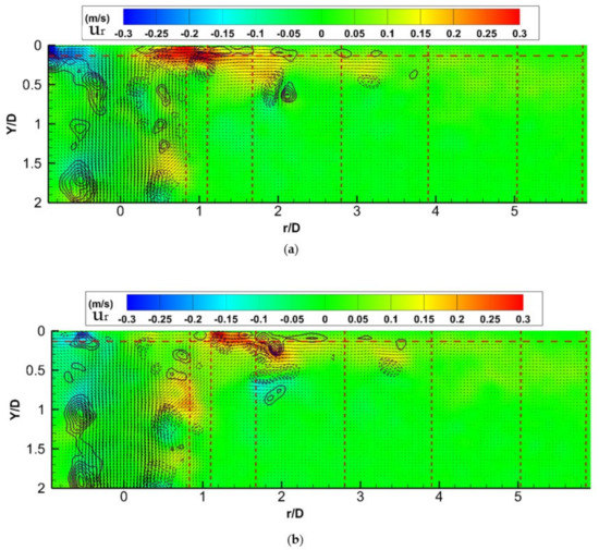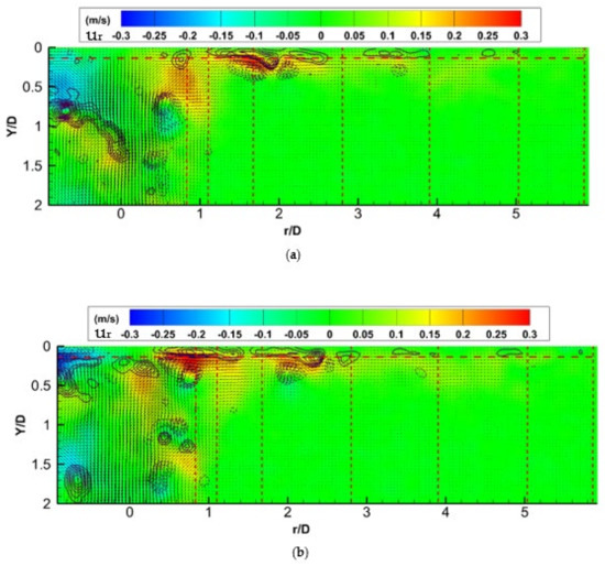 Figure 4 and Figure 5 present instantaneous radial velocity fields (iso-contours) along with the out-of-plan vorticity (iso-lines) and the velocity vectors in different jet regions for the stationary and rotational cases, respectively. The dotted vertical lines correspond to the radial positions discussed in Figure 2.