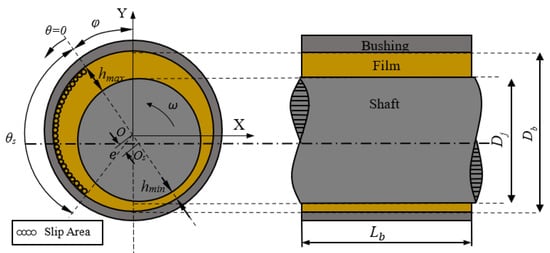 Numerous advantages accrue from the use of slip-on journal bearings. Ma et al. [] were the first to explore journal bearing lubrication with slip. They simulated slip conditions by limiting the amplitude of the shear stress on the fluid surface and observing the flow of journal bearing. They observed that by employing slip/no-slip situations, the increased load lifting capacity of the journal bearing and the reduced coefficient of friction were noted. Furthermore, slip/no-slip can also improve the stability of journal bearings [,]. Another study on slip/no-slip areas showed that journal bearings work exceptionally well when the eccentricity ratio is low []. According to Tauviqirrahman et al. [], including heterogeneous slip/no-slip zones onto journal bearings can increase load-carrying capacity by more than 100% while lowering the maximum operating temperature by up to 25%. Moreover, to achieve the best benefit from the slip boundary, the position of the provided slip must be carefully considered. Zhang et al. [] investigated the effect of the slip location in journal bearings. They observed that depending on the location of the given slip position, the use of slips might have both positive and negative consequences. Lin et al. [] concluded that the slip area should be located within the pressure-rising zone, not outside of it. Later, Cui et al. [] demonstrated the best position for slip-on journal bearings. It was revealed that the optimal slip area is exactly before the minimum film thickness, which is the convergent journal bearing region. Based on the available literature as mentioned, it seems that all works mentioned earlier focusing on the application of slip boundary on journal bearings assumed that the lubricant used is under Newtonian behavior.