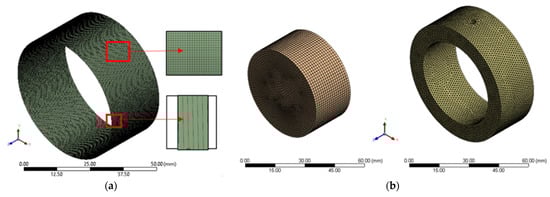 The elastohydrodynamic lubrication was considered in this paper. This numerical computation occurs in both the fluid and solid domains. As a result, the meshing procedure is carried out on these two domains. The mesh in the fluid domain is uniform hexahedral. Applying the sweep, edge scaling, and face meshing procedures, the 6 × 356 × 50 mesh is generated in the radial, circumferential, and axial directions, respectively. It results in 106,800 components for the fluid domain. The mesh density for the shaft and bearing in the solid computational domain (shown in Figure 3) is built according to the configuration of the fluid mesh for all directions to achieve conformity and provide a satisfactory coupling setup during the calculations. As a result, the matching grid generated for the solid domain is 185,815 elements. In addition, in this study, the independent grid test is performed to find the most efficient use of the grid while taking the least amount of calculation time. The addition of meshing tests the radial direction, and the number of layers test the radial direction (2, 4, 6, 8, 10). When the number of radial meshing in the layer exceeds 6, the error value does not differ considerably (less than 1 percent). As a result, there are six meshing layers in the radial direction.