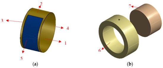 Boundary condition of computational (a) fluid domain; (b) solid domain; 1—moving wall; 2—stationary wall; 3—inlet; 4—outlet; 5—slip area; 6—contact with stationary wall; 7—contact with moving wall.