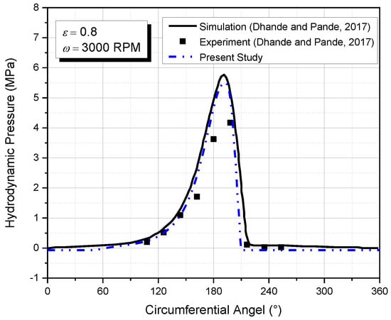 Comparison of hydrodynamic pressure between the result of the present study and the reference []. The numerical results are evaluated at mid-plane z/L of 0.5, rotational speed of 3000 rpm, and eccentricity ratio ε of 0.8.
