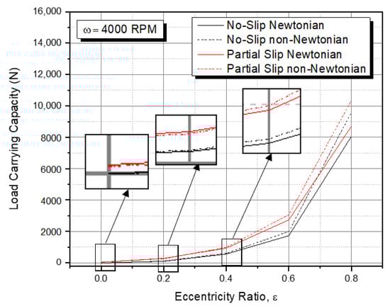 Figure 11 depicts the positive effect of partial slip in terms of load-carrying capacity values for several eccentricity ratios for two conditions, i.e., non-Newtonian and Newtonian. It is noted that the value of the load-carrying capacity at zero eccentricity ratio is zero, indicating that hydrodynamic pressure is unable to produce pressure sufficient to lift the shaft. Based on Figure 11, it can be shown that the value of the increase in load-bearing capacity decreases as the eccentricity increases in both Newtonian and non-Newtonian cases. It is interesting to note that the positive effect of the use of the engineered slip is more pronounced for lower eccentricity ratios. Furthermore, under this situation (i.e., lower eccentricity ratios), the use of the non-Newtonian fluid is not superior in comparison to that of a Newtonian fluid. However, for higher eccentricity ratios, non-Newtonian lubricants are recommended to improve load-carrying capacity over Newtonian lubricants. It is understandable because, as mentioned in the previous section, the slip effect goes off when the journal bearing operates in a high eccentricity ratio. In this way, the effect of the non-Newtonian lubricant becomes stronger for improving lubrication performance compared to the slip effect. It is also observed from Figure 11 that employing an engineered slip/no-slip pattern produces the enhancement of the load-carrying capacity by up to 170% and 125%, respectively, for the Newtonian and non-Newtonian fluids.