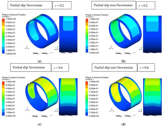 Figure 7 shows the effect of the eccentricity ratio on the load-carrying capacity under different surface and lubricant conditions. Based on Figure 7, some specific characteristics can be drawn. Firstly, the load-carrying capacity increases as the eccentricity of the journal bearing increases. Variations in the flow cross-sectional area of the journal bearing are caused by the widened gap caused by eccentricity. Due to the variation in the cross-sectional area of the fluid flow, the pressure distribution in the fluid flow area of the journal bearing is not uniform. Secondly, as can be seen from Figure 7, at an eccentricity of 0.6, the value of the load-carrying capacity in the case of the Newtonian slip condition is greater than that of the non-Newtonian no-slip one. Meanwhile, at the eccentricity of 0.8, there is a crossing of values which makes the value of the load-carrying capacity of the non-Newtonian no-slip geometry larger than that of the Newtonian partial slip case. The main reason behind this is that the positive effect of slip reduces when the higher eccentric ratio is used, as discussed by several researchers, for example in [,,,]. Thirdly, even with a zero eccentricity, the use of partial slips can generate hydrodynamic pressure. It is well understood that without the use of partial slips, hydrodynamic pressure cannot be generated, and thus the journal bearing cannot be lifted. It prevails both for Newtonian and non-Newtonian cases. Fourth, the load-carrying capacity created by the non-Newtonian fluid at low eccentricity (i.e., ε = 0.2 in this case) has a lower value than that of a Newtonian fluid. Meanwhile, at higher eccentricity ratios (i.e., ε = 0.4; 0.6; 0.8), the bearing lubricated by non-Newtonian fluid always has a higher value of load-carrying capacity. To figure out why the load capacity under non-Newtonian conditions is lower at low eccentricity than under Newtonian conditions, the vapor volume fraction inside the bearing needs to be observed, as depicted in Figure 8. Figure 8 shows in detail how the viscosity that occurs in the slip region increases the value of the negative pressure region, resulting in a higher cavitation value in that area. This is especially true when the eccentricity is low (i.e., ε = 0.2). As shown in Figure 8c,d, the cavitation distribution that occurs in the case of low eccentricity is wider than that in the case of high eccentricity.