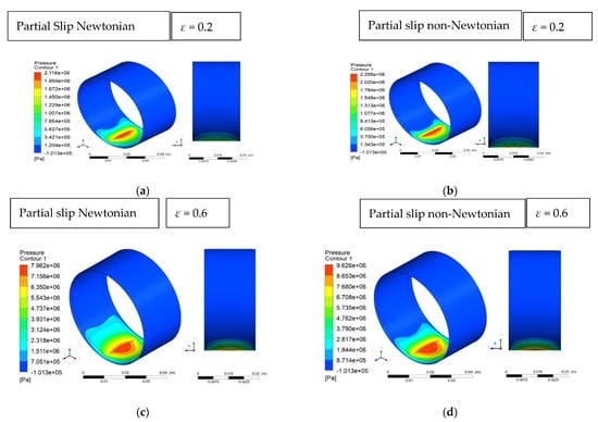Pressure distribution for partial slip bearing for case: (a) Newtonian, ε = 0.2; (b) non-Newtonian, ε = 0.2; (c) Newtonian, ε = 0.6; (d) non-Newtonian, ε = 0.6.