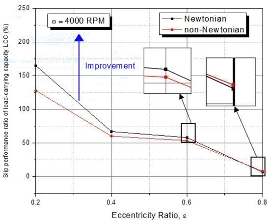 Slip performance ratio of load-carrying capacity (LCC) for several eccentricity ratios ().