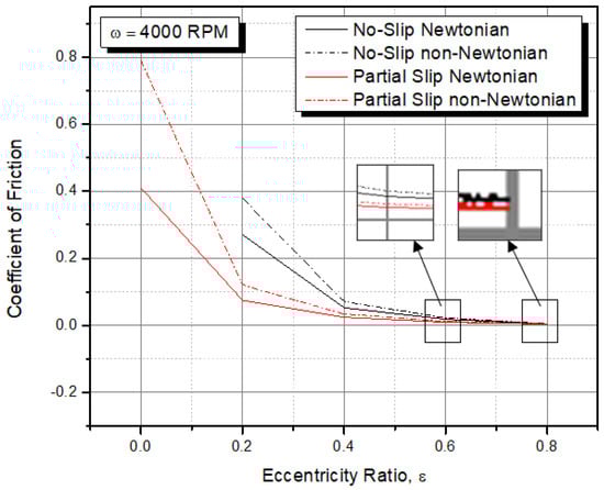 Regarding the non-Newtonian effect, an interesting feature can be observed based on Figure 12. The simulation results show that non-Newtonian fluid, either combined with slip or not, gives a higher coefficient of friction for all the eccentricity ratios considered here. This finding is in good agreement with the reference [,]. In the study of Kalada et al. [], the addition of CuO nanoparticles to 15w40 base oil in journal bearings indicated that the lubricant became non-Newtonian and resulted in an increase in load-carrying capacity and an increase in the friction coefficient. It was also demonstrated in the experiment by Shinde and Soni [] that the addition of CuO nanoparticles to 30 SAE oil created similar behavior (i.e., the increased coefficient of friction).