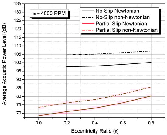 Slip performance ratio of average acoustic power level PA for several eccentricity ratios for the case of Newtonian and non-Newtonian fluids ). The negative sign indicates a performance improvement.