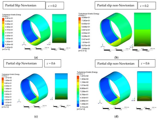 Turbulence kinetic energy for partial slip bearing for case: (a) Newtonian, ε = 0.2; (b) non-Newtonian, ε = 0.2; (c) Newtonian, ε = 0.6; (d) non-Newtonian, ε = 0.6.