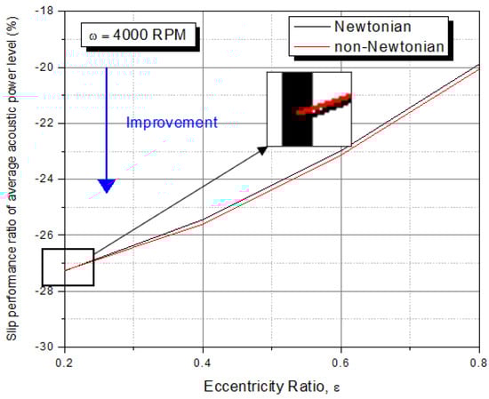 Regarding the effect of the non-Newtonian fluid, it is necessary to directly compare the performance of the average acoustic power level for two conditions, i.e., Newtonian and non-Newtonian. Here, the comparison is made by introducing the slip performance ratio of the average acoustic power level. Figure 15 shows the beneficial effect of engineered slip for two conditions, i.e., Newtonian and non-Newtonian, in terms of average acoustic power level. Based on Figure 15, it is found that the difference in the performance ratio of the average acoustic power level between Newtonian and non-Newtonian cases increases with increasing the eccentricity ratio. For example, for ε = 0, the performance ratio in the case of Newtonian fluid is around 28.7%, while for non-Newtonian fluid, the performance ratio is just 28.4% (or 0.3% higher). When the eccentricity ratio is increased to, say, 0.8, the non-Newtonian lubricant gives a lower average acoustic power level. It indicates that when engineered partial slip is combined with non-Newtonian fluid, the reduced bearing noise is observed even though it is not so significant: it is just around a 1% improvement.