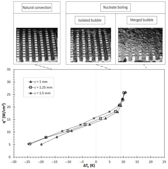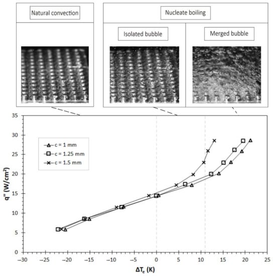 In this study, an isolated bubble regime was observed between 0 K and 11 K for circular and 0 K and 9 K for rectangular pin fin arrays. As presented in Figure 6, a small bubble started to generate individually and detached in a straight path without any interference from the other active nucleation sites. Unlike the phenomenon observed in the natural convection regime, there was a significant discrepancy in the boiling curve for different fin gaps. This phenomenon indicates the importance of the gaps in the boiling heat transfer mechanism which is discussed further in the next section.
