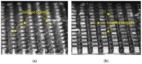 The images captured during the experiment (see Figure 7) demonstrated the incipience of bubble merging around 23.0 W/cm2 and 23.6 W/cm2 for circular and rectangular, respectively. The figures clearly demonstrate the bubble crowding, whereby the generated bubbles turned into a blanket of vapor before detachment. Furthermore, the detached bubbles illustrated a larger diameter compared with those observed in the isolated bubble regime.