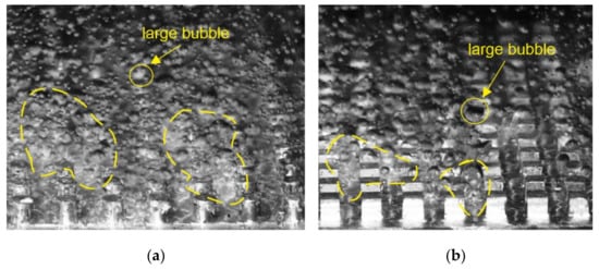 The discrepancy of bubble generation observed from two different heat fluxes: (a) q″ = 14.5 W/cm2; (b) q″ = 20.2 W/cm2.