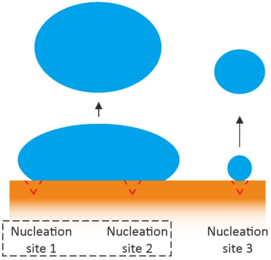 By increasing the applied heat, the number of active nucleation sites increases. This is marked by the denser distribution of the bubble across the region. Furthermore, an increase in bubble departure frequency was also observed, which is indicated by a shorter interval of bubble detachment from the same nucleation site (see Figure 10). By matching these trends with Equations (6) and (7), it was proven that the increasing trend is a result of bubble dynamics on the hot surface.