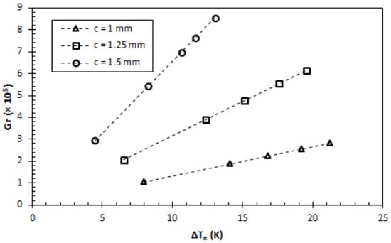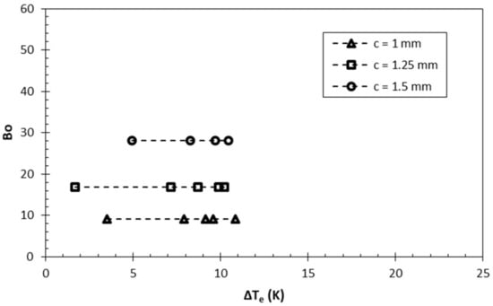 By considering the order of magnitude from these results (Bo > 1), it is indicated that the system is relatively unaffected by the surface tension, but rather influenced by buoyancy force. As the gap rose (hence the hydraulic diameter), the buoyancy force increased by the quadratic order as expressed by the numerator of Equation (9). This increase enhanced the bubble dynamics on the adjacent surface, allowing the heat transfer coefficient to rise.