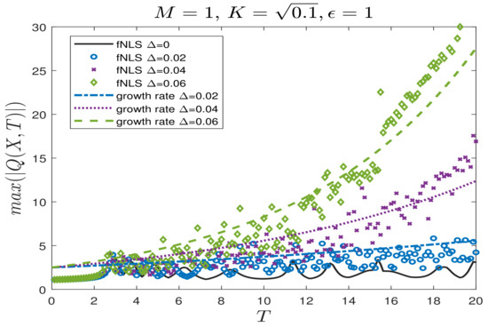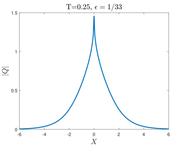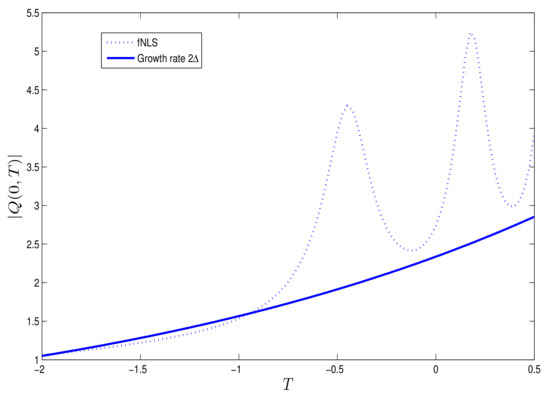 When , we solve numerically the forced NLS Equation (7) with the initial condition corresponding to this Peregrine breather (10) at . With and 0.2, the results are shown in Figure 1, Figure 2 and Figure 3. The numerical results agree well with the analytical solution over the entire simulation measured by the RMSE of in order of . In the forced case, the amplitude initially grows exponentially at the rate as shown in Figure 3 that agrees with the asymptotic prediction by Grimshaw [18] using the energy law (9) as described above. Note that in (9) scales as modulo a dependence on ,