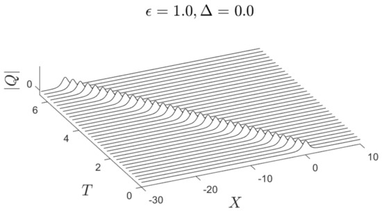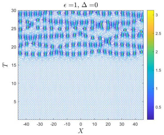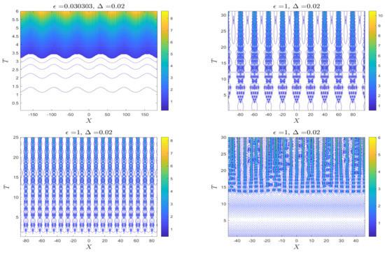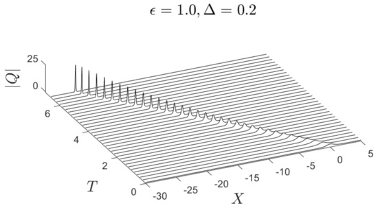 The case when , and is shown in Figure 16. Here is larger and a different picture emerges, looking more like the modulation instability cases shown in Case 4 below. There is evidence of the formation of both breathers and solitons with amplitudes increasing.