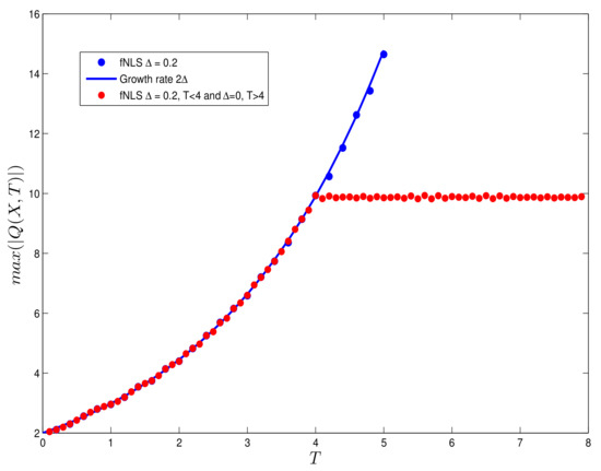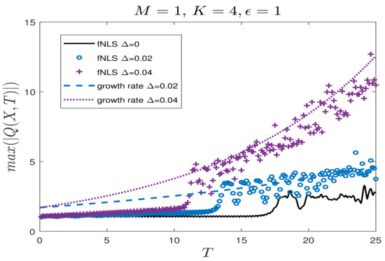 The case when , and is shown in Figure 12. Here , but unlike the two previous cases shown in Figure 10 and Figure 11 when a periodic chain of breathers forms. This case is converted to several growing solitons, now in the forced simulations only a single stationary soliton with a growing amplitude emerges. Plot of the maximum value of for each T and is shown in Figure 13. The amplitude for this forced NLS case grows oscillatory with an overall growth rate . After the forcing is turned off, and the maximum amplitude is shown in Figure 14; it does not increase exponentially but it changes periodically.