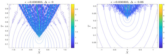 Note that we only show cases with , as M can be absorbed into the small parameter in the derivation of (7), but we did run some simulations for a larger . Also and are not independent parameters, as rescaling is equivalent to replacing by and then adjusting the time scale . Nevertheless, we shall vary both and , as well as . For small , the dispersion is initially weak and in the absence of forcing the solution evolves into a gradient catastrophe, followed by the generation of a family of Peregrine breathers (see Grimshaw and Tovbis [3]).