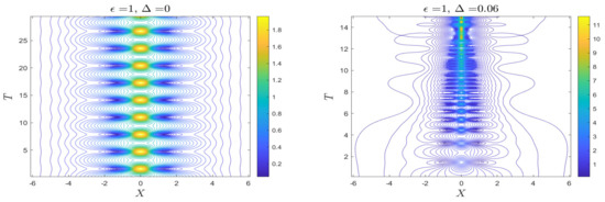 Modulation instability and the subsequent formation of small amplitude waves that generate large amplitude waves or sometimes rogue waves has been studied experimentally for water waves by many authors (see for instance [28]). This large wave is generally unstable due to its growing nonlinear wave packet amplitude when the Benjamin–Feir index (BFI) increases. In this ocean application, large-amplitude waves are generally unstable due to the growing nonlinear wave packet amplitude and modulation instability, measured by the BFI, the ratio of wave steepness (nonlinearity) to spectral bandwidth (dispersion). In this work, (see Grimshaw and Tovbis [3]). Even for which is a moderate value, external forcing that can be viewed as wind blowing over the sea causes modulation instability, and large-amplitude waves are developed. For instance, see Figure 18 for initial periodic plane wave with wind effects . When there is a wind effect , we characterise the development of large-amplitude waves into two stages: the first stage is the development of breathers which could be interpreted as a random sea state as time evolves, and then a second stage forms with large-amplitude waves. The large waves in the second stage collect energy from neighbouring small waves with different wave frequencies. Rogue waves are observed when the BFI is large with amplitudes three or four times the background sea state during their evolution (see for instance [2,28]). In our present work even for modulation instability occurs in the predicted long-wave perturbation range () in the first stage, but then large amplitude waves develop due to the wind effect. The larger the value of the wind forcing coefficient, the larger are the waves in the second stage, and they become unstable. Instead of using the periodic wave plane as an initial condition, in case (3) the initial condition of a slowly varying long wave perturbation with a sech-profile also develops into a modulation instability region.