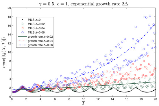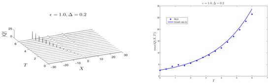 The case when , and is shown in Figure 15. As , this is equivalent to Case 2, and indeed only a single stationary soliton forms, with a growing amplitude at exactly the predicted exponential rate of , see Grimshaw [17].