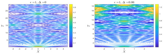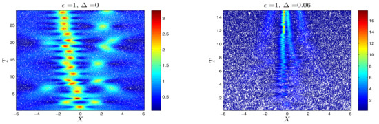 Case 4: The results with initial random noise are shown in Figure 26 for , , , and . There is no modulation instability in this case. In the absence of forcing (see Figure 26 (left)), periodic plane waves are generated. Initial random noise perturbs the pattern of these waves while the maximum amplitude over the entire domain is preserved. In contrast, for the forcing case, the maximum amplitude is increased with a mean growth rate (see Figure 26 (right)). Compared with the case without initial random noise in Figure 20, when the maximum amplitude grows but requires a certain time interval for wave growth. Initial random noise stimulates the maximum growth rate to be earlier with the robust growth rate . Instead of increasing K, we fixed and increased . We found that for the time for the amplitude to be stimulated but finite, which is much larger than for the case of smaller .