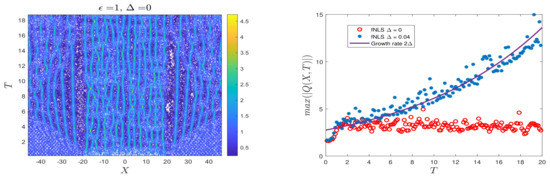Case 1: The effect of initial random noise on the Peregrine breather is shown in Figure 22 with , , and . It can be compared to the case without initial noise shown in Figure 2. The main feature of breathers can still be seen in Figure 22 (left). The maximum amplitude over the entire domain is shown in Figure 22 (right) and is comparable with the theoretical growth rate . The initial random noise again affects the increment of maximum amplitude earlier than , as before when . The position of these large amplitude waves remains relatively stationary.